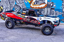 The Mint 400 has a long history dating all the way back to the 1960s. Originally organized by the Mint Hotel and Casino in downtown Las Vegas, the Mint has had its ups and downs throughout the decades. Today it’s more popular than ever before thanks to its resurrection in 2008. Virtually every known desert racer has entered the Mint 400, and a lucky few have even managed to win it. Unfortunately for many more, the legendarily brutal course has claimed more than its fair share of entries. Simply finishing the Mint is an accomplishment, let along making it to the podium. This year’s Mint 400 had a record number of entries, and Matt Lovell’s #7244 truck was lucky enough to draw first off the line for the 7200 class. This meant plenty of clean air and a chance to stay at the front of the pack. Matt Lovell assembled a team of nearly 25 people consisting of friends and family members, all of them volunteering their time to help get #7244 to the finish line. After participating in the parade down Las Vegas boulevard with fiancé Jesse in the passenger seat, Lovell and the team took part in tech and contingency. Basically a giant party on Fremont Street in downtown Vegas, contingency for the Mint is the stuff of legend. As expected, Matt Lovell’s entry passed through tech with flying colors and also spent some time at several sponsor booths, including LazerStar Lights, Raceline wheels, King Shocks, and Falken tire. After a quick photo shoot with SnM Media, the team relocated to Primm, Nevada, which was the starting point for the Mint 400 this year. Race day came early for the team as they made final preparations to the truck, organized spares and gear, and divided the team into three groups that would staff the main pit, plus two remote pits. The Mint is a loop race, so Lovell would have to make three laps on the 130-mile course. A loop race also means a full day of dodging slower vehicles and staying out of the way of the faster trophy trucks and Class 1 cars. Lovell lined up in the front of the 7200 class along with navigator Rob Nelson, all strapped in a ready to go. The green flag dropped and the duo was on their way, gunning to stay in front of the pack and make good time through the first lap.